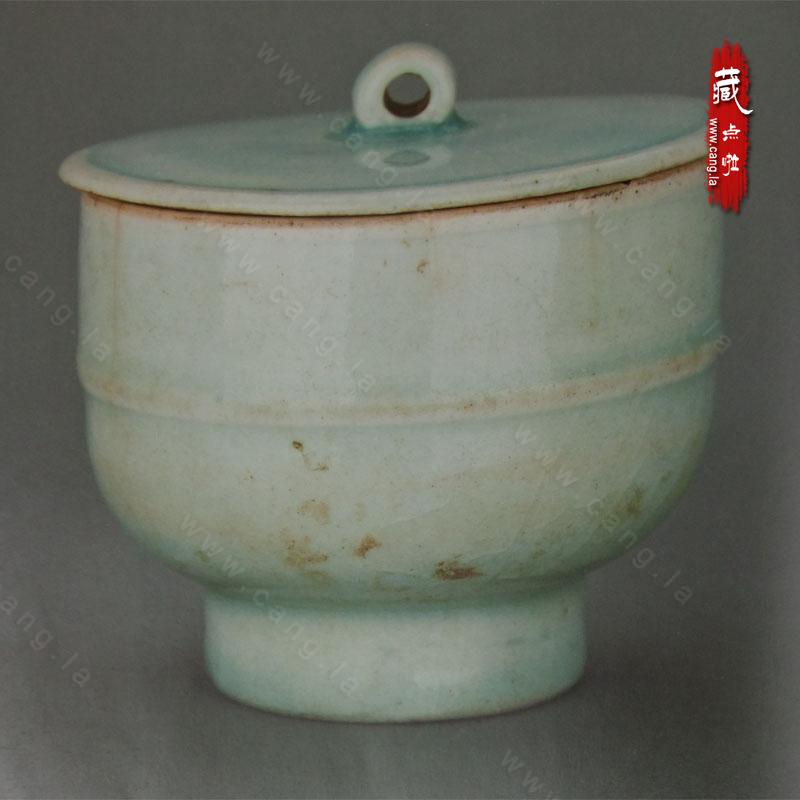 直口微敛,深弧腹,圈足。带盖,子母口,盖面拱起,扁形小圆钮。厚釉,釉色白中泛青。口沿、盖口、圈足底均无釉、有少许锅巴印。