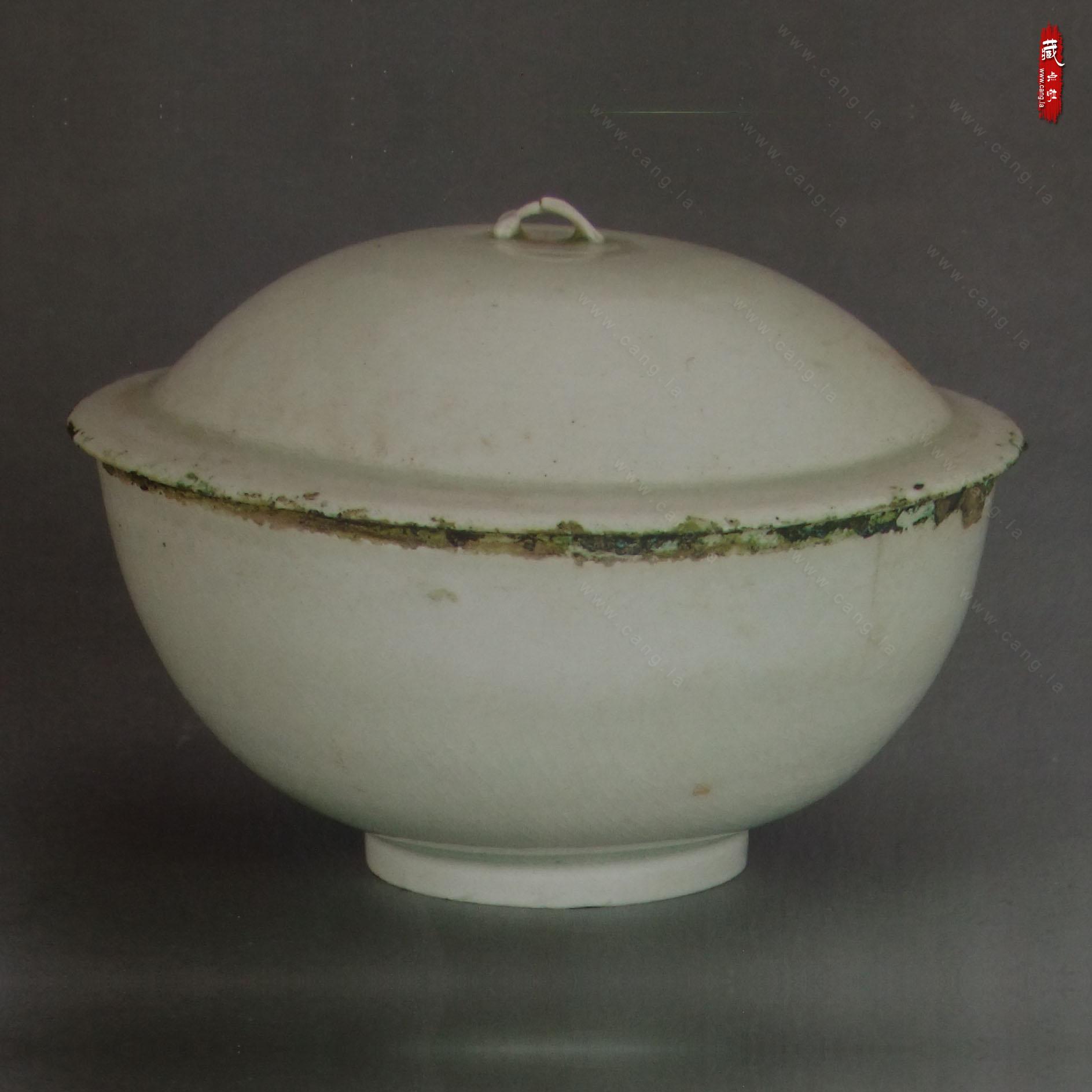 圆轮制,由盖和碗组成。盖半球形弧顶,简化的螭形纽,宽沿,子口,圆唇。碗母口,方唇,直口,芒口,口沿饰铜扣,弧壁,壁很薄约0.5毫米,透光,圈足。白胎,除盖沿内、外壁,通体施月白色釉,杯身釉面有大面积开片,转折处釉色微泛青色。